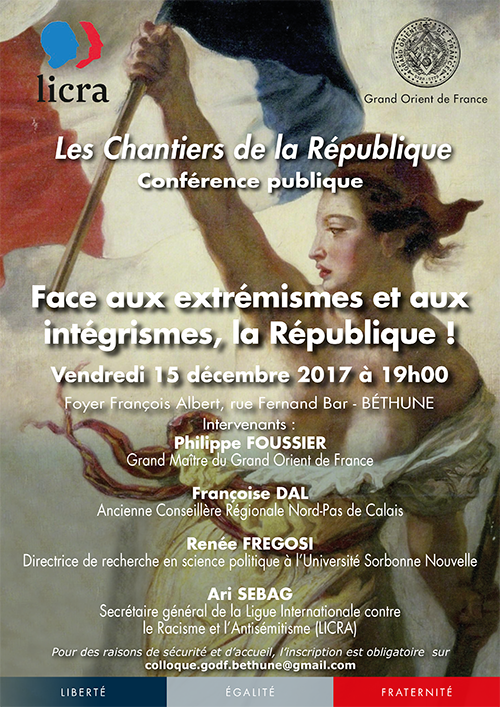 Vendredi 15 décembre 2017 à 19h00 – Conférence publique dans le cadre des Chantiers de la République à BETHUNE sur le thème « Face aux extrémismes et aux intégrismes, la République ! »