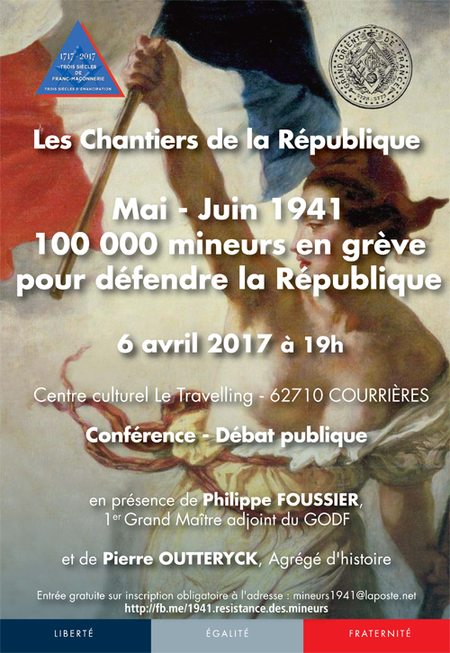 Le Grand Orient de France, dans le cadre des Chantiers de la République, vous propose une Conférence-débat le jeudi 06 avril 2017 à 19 heures sur le thème « Mai – Juin 1941 100 000 mineurs en grève pour défendre la République«