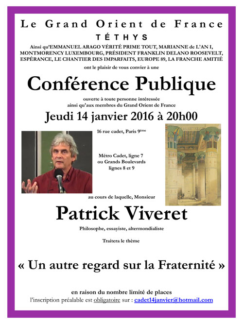 Paris – Jeudi 14 janvier 2016 à 20 heures, conférence Publique à Paris du Grand Orient de France (GODF) , ouverte à tous avec M. Patrick VIVERET Philosophe, essayiste, altermondialiste sur le thème « Un autre regard sur la Fraternité«