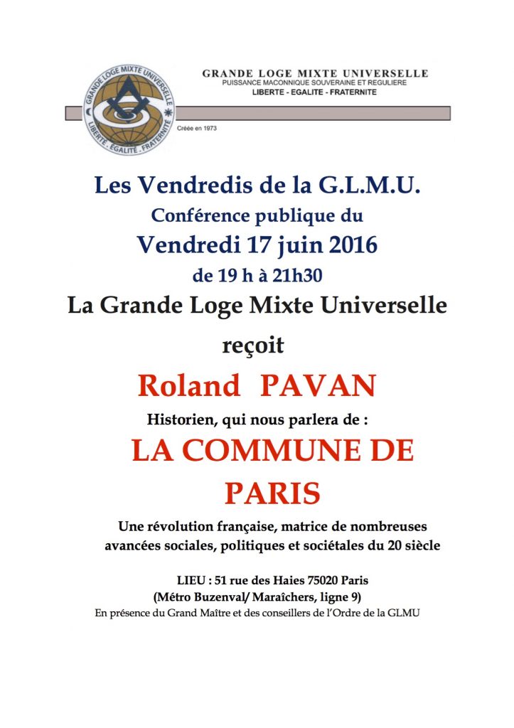 Paris – Le prochain vendredis de la GLMU qui aura lieu le vendredi 17 juin 2016 de 19 h à 21 h 30 au Temple de la GLMU reçoit Roland Pavan, Président de Terre et Volcans qui évoquera « La Commune de Paris« : une révolution française, matrice de nombreuses avancées sociales, politiques et sociétales du 20è siècle