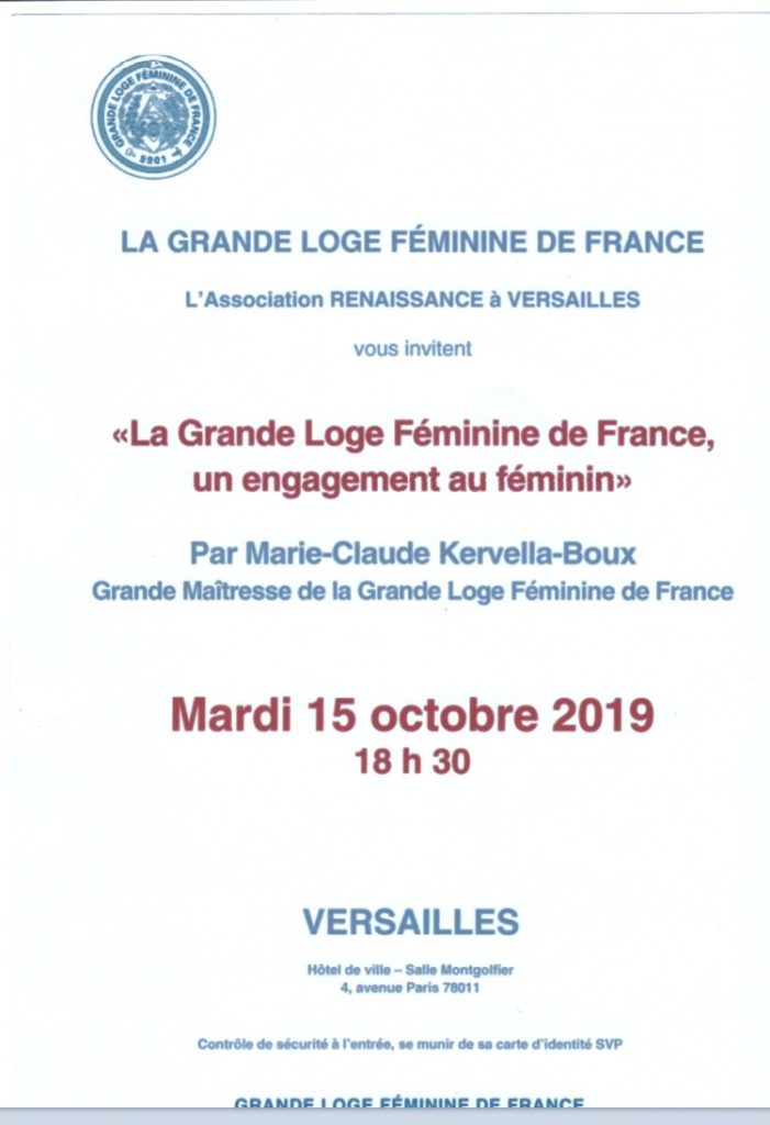 L’association RENAISSANCE à Versailles, et la Grande Loge Féminine de France (GLFF) organise une conférence publique le