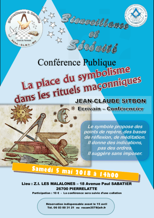 PIERRELATTE – Samedi 05 mai 2018 à 14 heures – conférence publique avec Jean Claude Sitbon, écrivain, conférencier, sur le thème « La place du symbolisme dans les rituels maçonniques »