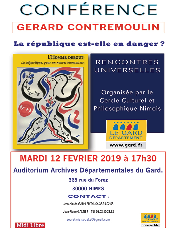 Conférence publique organisée par le Cercle Culturel et Philosophique Nîmois à l’Auditorium Archives Départementales du Gard, à NÎMES.