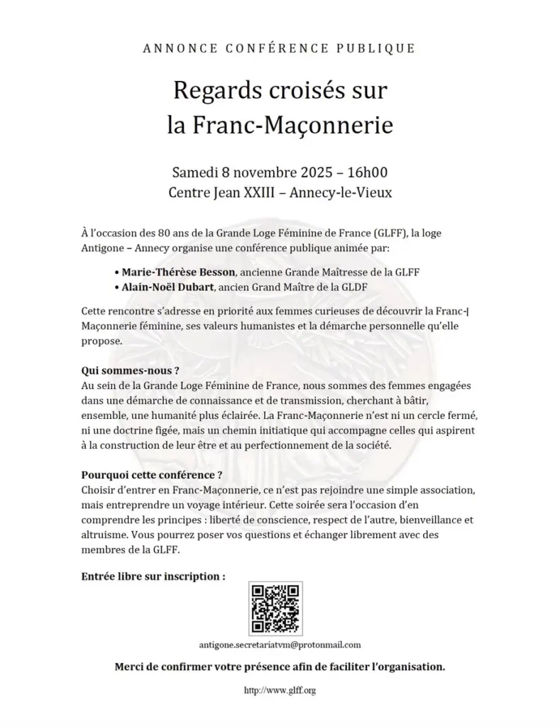À l’occasion des 80 ans de la Grande Loge Féminine de France (GLFF), la loge Antigone – Annecy organise une conférence publique intitulée « Regards croisés sur la Franc-Maçonnerie ».