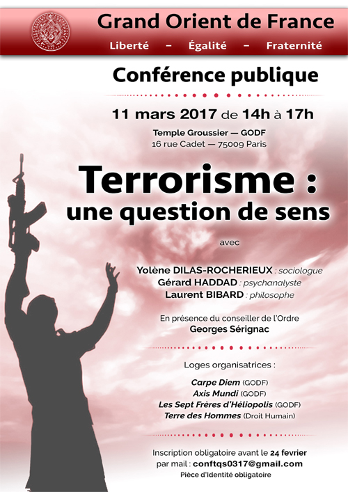 Samedi 11 mars 2017 à 14 heures – Conférence publique organisée par des Loges du Grand Orient de France et du Droit Humain à PARIS sur le thème « Terrorisme : une question de sens »