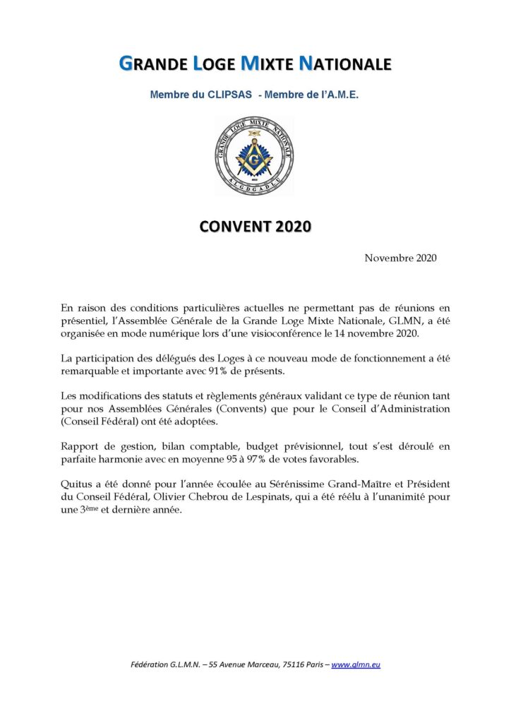 Le Convent qui s’est déroulé en visio samedi 14 novembre 2020 a vu la réélection du Grand-Maître, Olivier Chebrou de Lespinats pour une 3ème année.