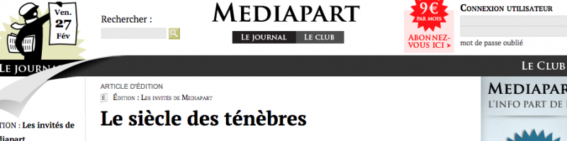 Intitulée « Le siècle des ténèbres », sur le site de MEDIAPART, la dernière tribune de Daniel KELLER, Grand Maître du Grand Orient de France, aborde « le modèle de civilisation » qui est le notre.