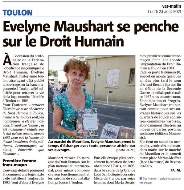 Son dernier livre, Le Droit Humain à Toulon : de 1903 à nos jours a fait l’objet récemment d’un article paru dans le quotidien d’information Var Matin