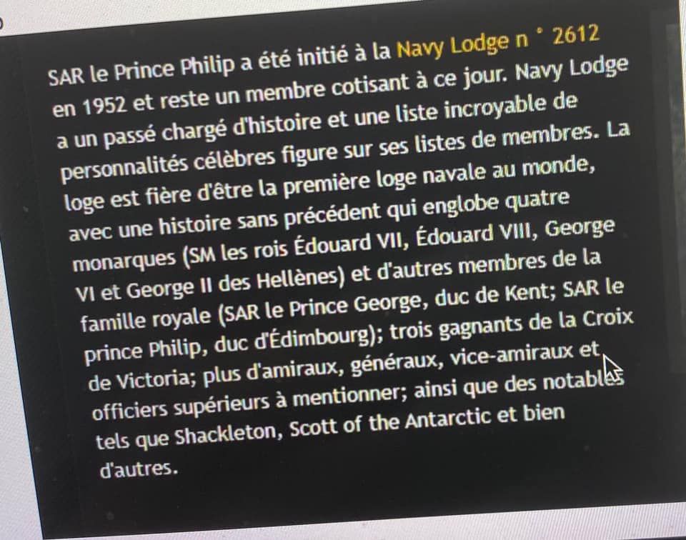 SAR le Prince Philip, initié à la « Navy Lodge » n ° 2612 en 1952, est passé à l’Orient Éternel