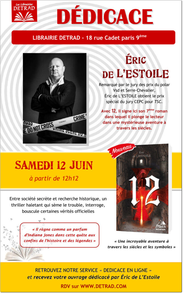 La librairie DETRAD annonce une séance dédicace avec Eric de L’Estoile auteur du roman historique, initiatique et prophétique 12 publié aux Editions Detrad en Mai 2021)