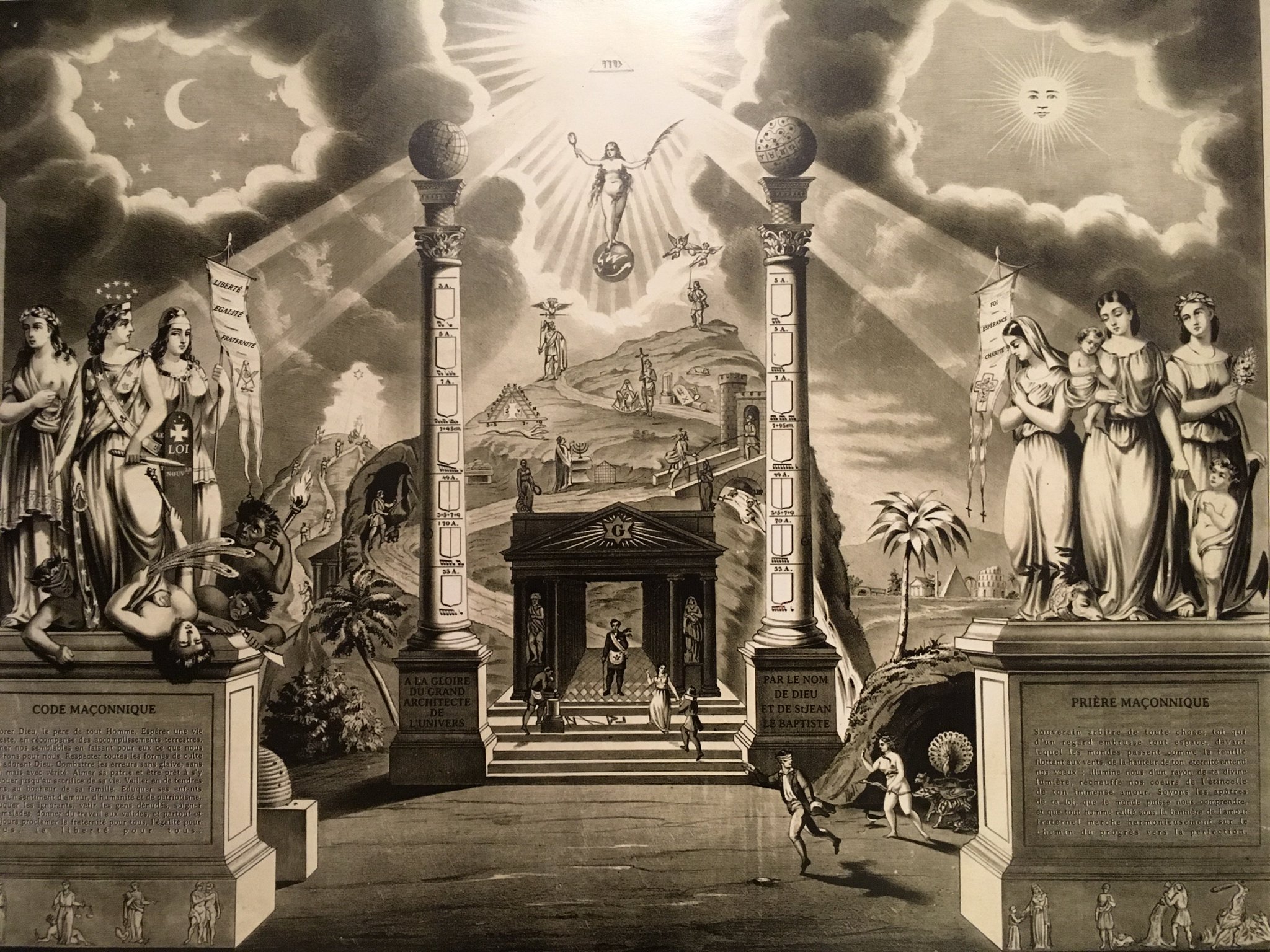Pas facile à dire. Regardez en bas sur les côtés droit et gauche car il peut y avoir le nom du dessinateur et du graveur. Cela donnera une idée de sa date. Quoi qu’il en soit, elle me semble avoir été dessinée au début du XIXe siècle (en regardant le style des vêtements vers 1830). Elle représente bien sûr la progression au REAA.