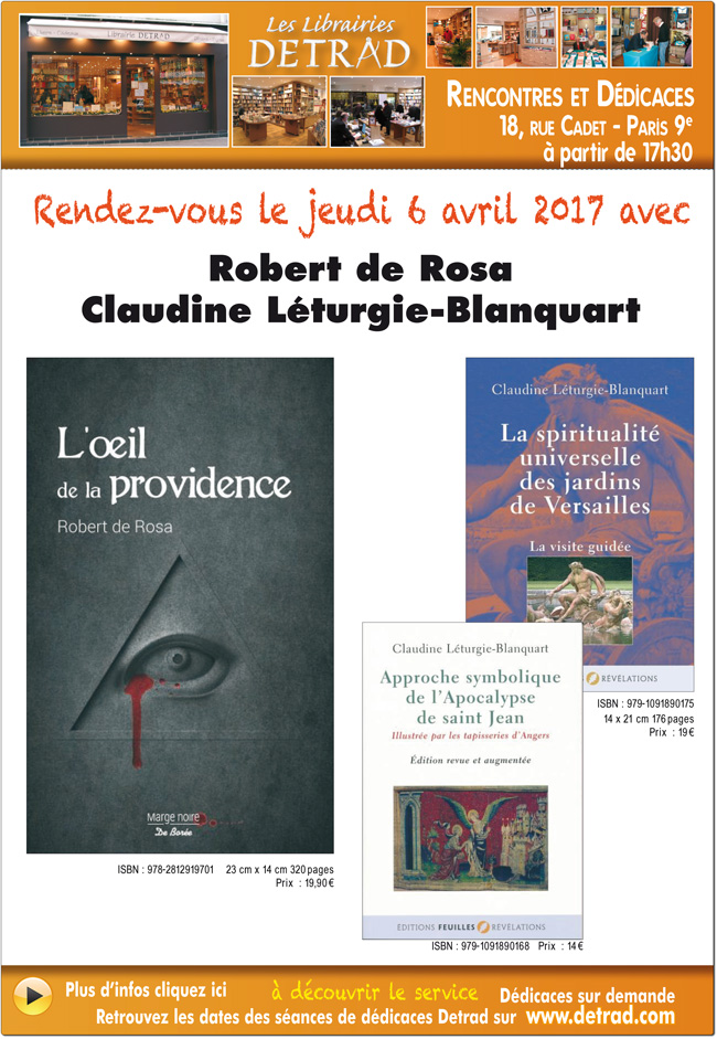 Paris – Jeudi 06 avril 2017 à partir de 17 heures 30, la librairie Detrad vous convie à venir rencontrer Robert de Rosa et Claudine Léturgie-Blanquart pour leur ouvrage respectif