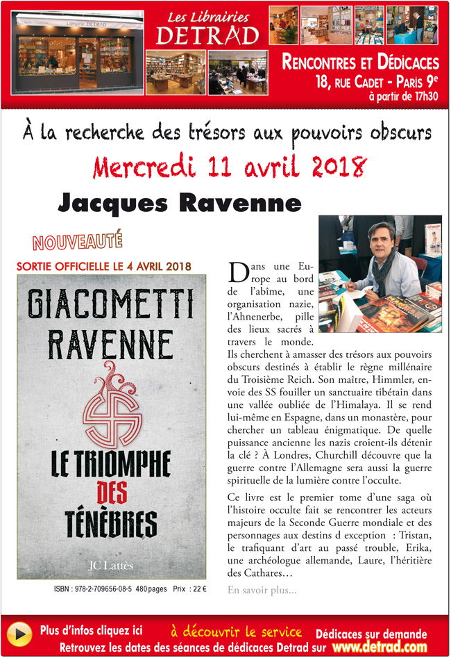 Paris –Mercredi 11 avril 2018 à partir de 17 heures 30, la librairie DETRAD vous convie à venir rencontrer Jacques Ravenne co-auteur du Le triomphe des ténèbres avec Eric Giacometti, (JC Lattes – 04/04/2018)