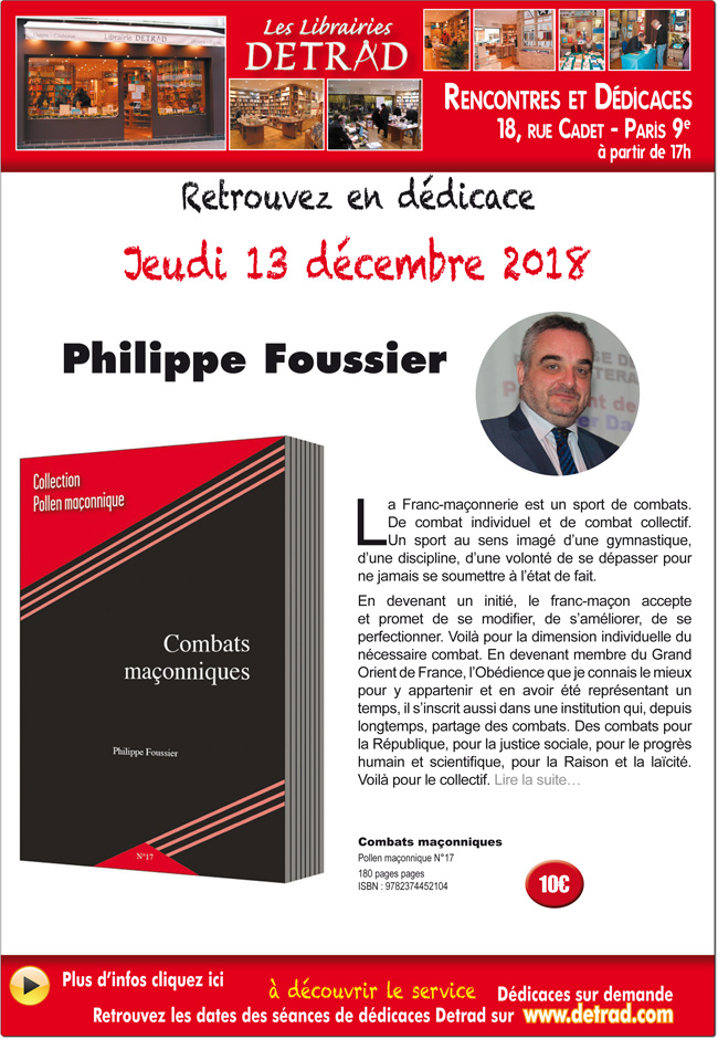 Paris – Le jeudi 13 décembre 2018 à partir de 17 heures, la librairie DETRAD vous convie à venir rencontrer Philippe FOUSSIER, passé Grand Maître du Grand Orient de France (GODF) pour son ouvrage COMBATS MAÇONNIQUES