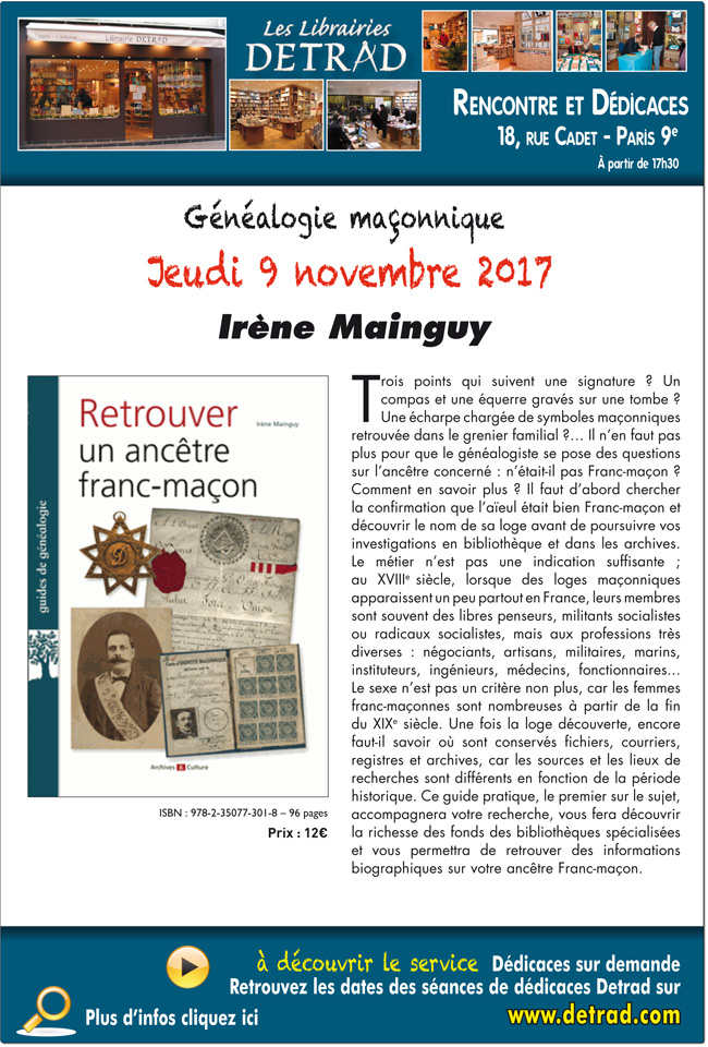 Paris – Jeudi 09 novembre 2017 à partir de 17 heures 30, la librairie DETRAD vous convie à venir rencontrer Irène Mainguy pour la sortie de son dernier ouvrage  » Retrouver un ancêtre franc-maçon  (Archives et Culture – 17 août 2017)