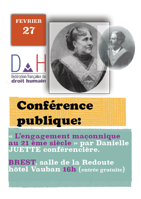 Brest – Samedi 27 février 2016 à 16h00, conférence publique avec Danielle JUETTE organisée par la loge IROISE (Fédération française du DROIT HUMAIN) sur le thème de la conférence : « L’engagement maçonnique au XXIème siècle »