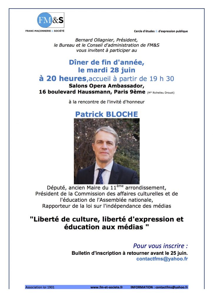 Le think tank Franc-Maçonnerie et Société (FM&S) organise son Dîner de fin d’année, le mardi 28 juin 2016 à 20 heures,sur le thème « Liberté de culture, liberté d’expression et éducation aux médias«