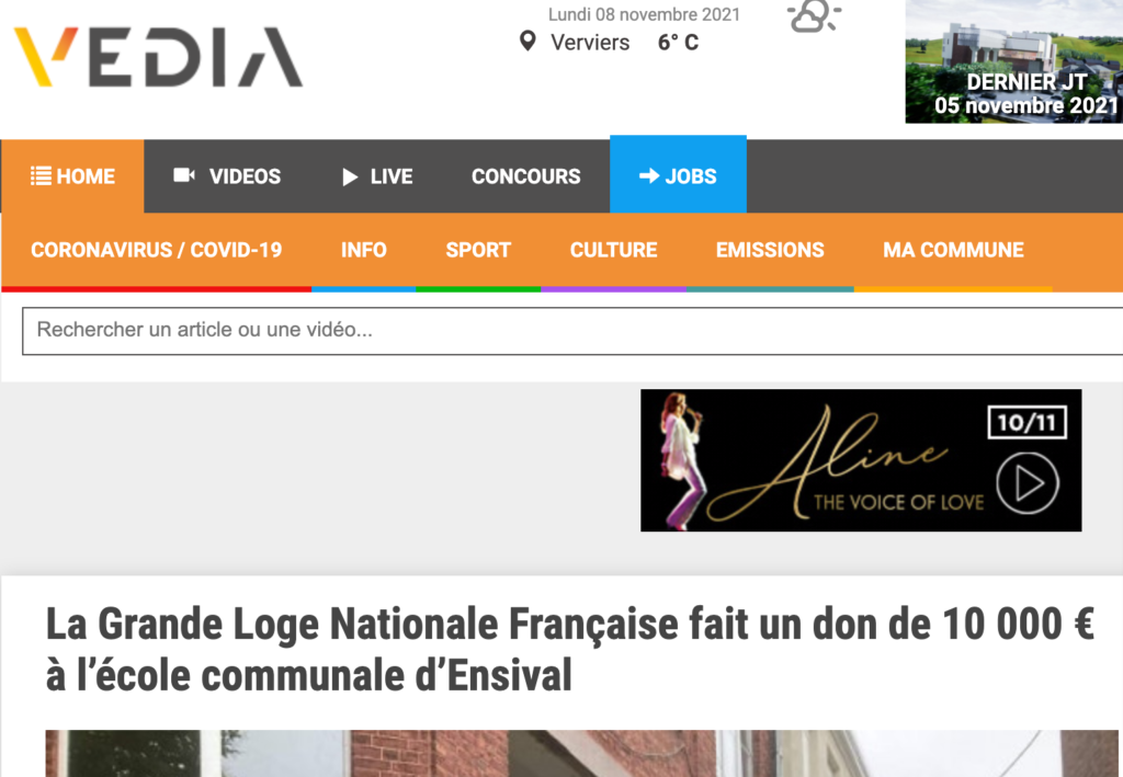 « La Grande Loge Nationale Française fait un don de 10 000 € à l’école communale d’Ensival » est un article paru sur le site belge de la télévision locale de la région de Verdiers, VEDIA :