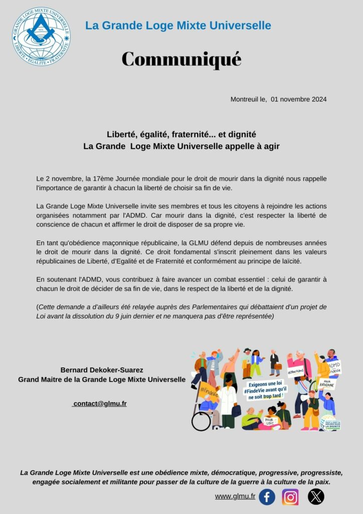 La Grande Loge Mixte Universelle (GLMU), en tant qu’obédience maçonnique républicaine, réitère son engagement en faveur de ce droit fondamental. Nous invitons nos membres et l’ensemble des citoyens et des citoyennes à rejoindre les actions organisées notamment par l’Association pour le Droit à Mourir dans la Dignité (ADMD) .