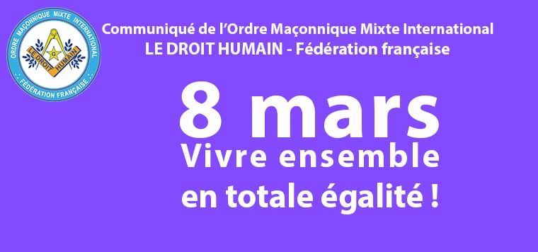 A l’instar des fondateurs de l’Ordre Maçonnique Mixte International LE DROIT HUMAIN, et chacun à notre niveau, il nous faut agir ensemble, femmes et hommes, pour une égalité durable et l’instauration de mesures concrètes afin de combattre l’invisibilité, la pauvreté, la violence, etc., c’est à dire toutes les discriminations que subissent les femmes en France et ailleurs dans le monde.