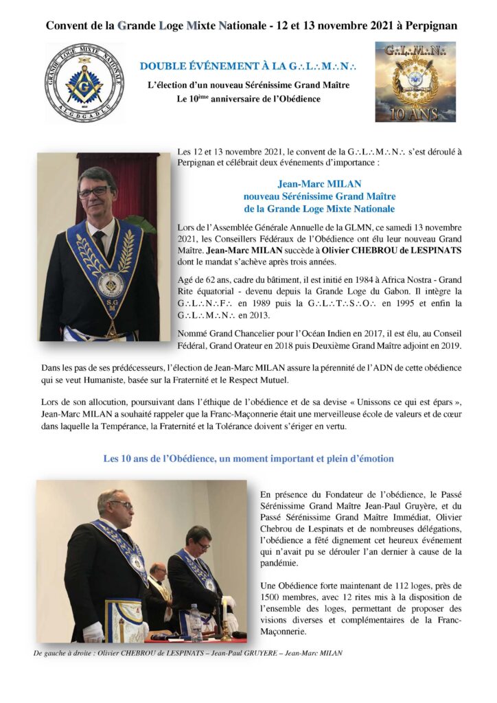 ELECTION DU NOUVEAU GRAND MAÎTRE DE LA GRANDE LOGE MIXTE NATIONALE Communiqués | 20 novembre 2021 | 0 | by A.S.