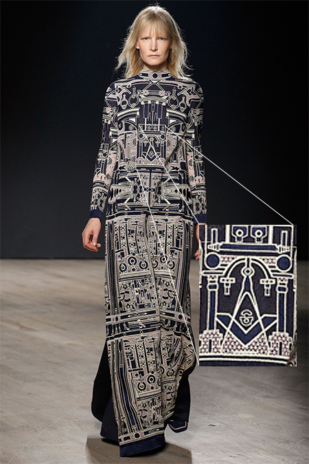 Après le créateur « Marios Schwab » qui avait fait montre d’inspiration en usant de symboles de toutes sortes et entre-autres maçonniques pour attirer l’œil sur ses créations lors défilé du Prêt-à-porter Printemps-été 2011. (voir l’article Des symboles « maçonniques » en Haute Couture !), voici qu’une jeune créatrice grecque installée à Londres, Mary Katrantzo, nous offre des vêtements avec une multitude de symboles, dont certains d’inspirations maçonniques.