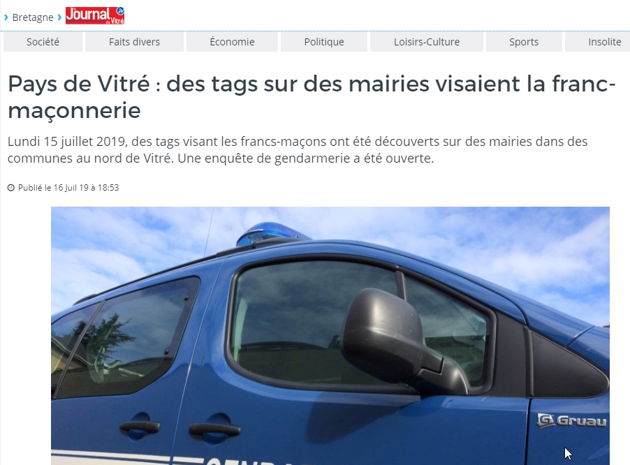 L’article du journal Actu.fr « Pays de Vitré : des tags sur des mairies visaient la franc-maçonnerie » relate les faits :
