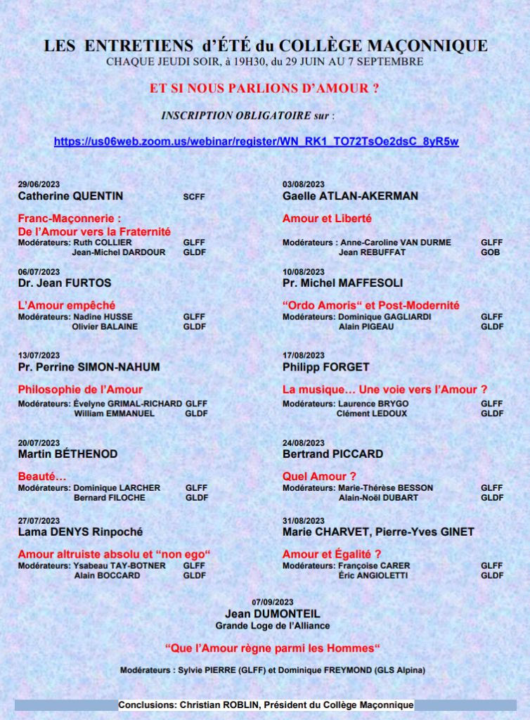 Voici le programme des Entretiens d’été 2023 du Collège Maçonnique organisé cette année par Marie-Thérèse Besson et Alain-Noël Dubart.