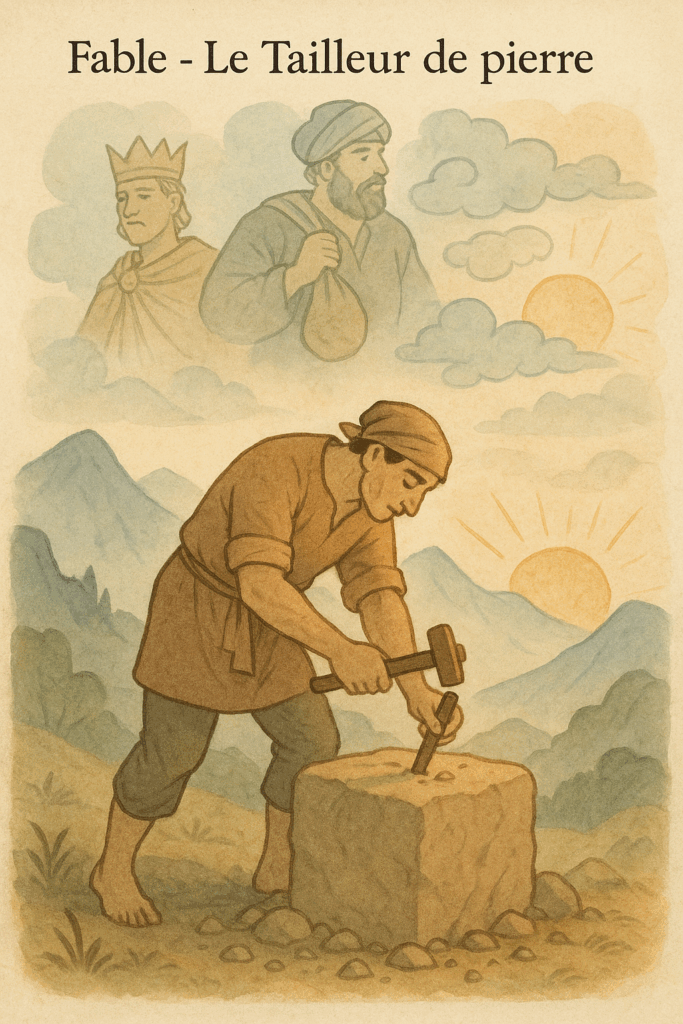 Un tailleur de pierre se rendait tous les jours au pied d’un grand rocher de la montagne pour en détacher des fragments dont il faisait des pierres tombales ou des murs de maisons. Il connaissait toutes les sortes de pierres et leurs différentes utilisations, et comme c’était un excellent artisan, sa clientèle était nombreuse et assidue. Ainsi, pendant longtemps, il vécut heureux, ne souhaitant rien de plus que ce que la vie lui accordait.