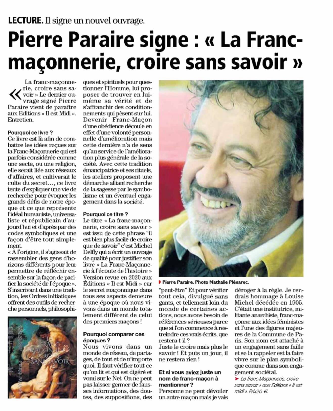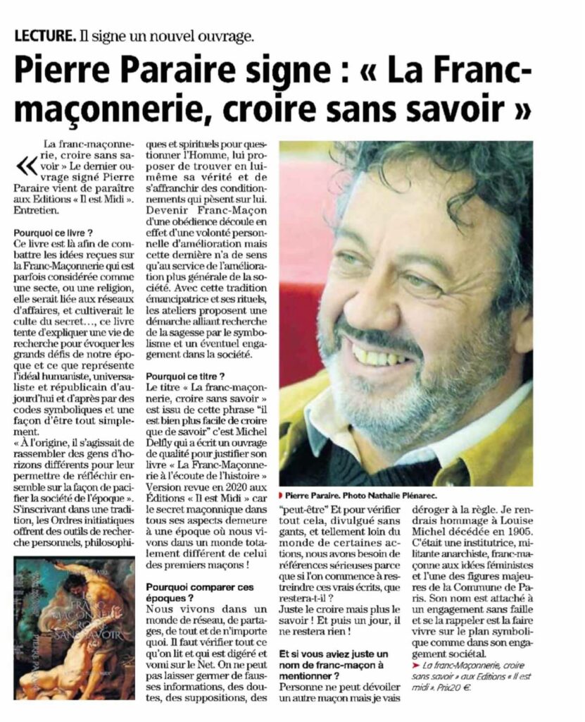 2 Entretiens dans la Dépêche du 15/01/2021, et du 21/01/2021 de Pierre Paraire, auteur de « LA FRANC-MAÇONNERIE « CROIRE SANS SAVOIR »,