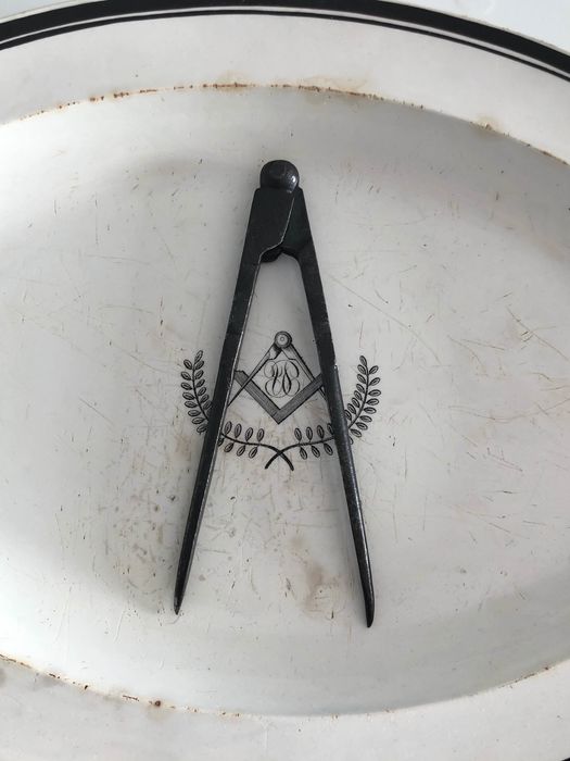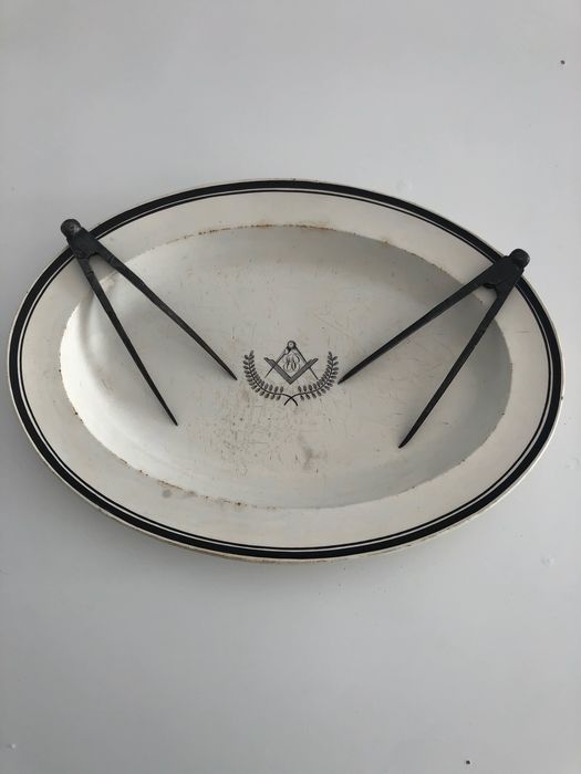 Grand plat oval franc maçon en faïence a décor imprimé ornée du compas-équerre et rameaux d’acacia Choisy Le Roy AVEC 2 magnifiques compas en métal 18ème siècle