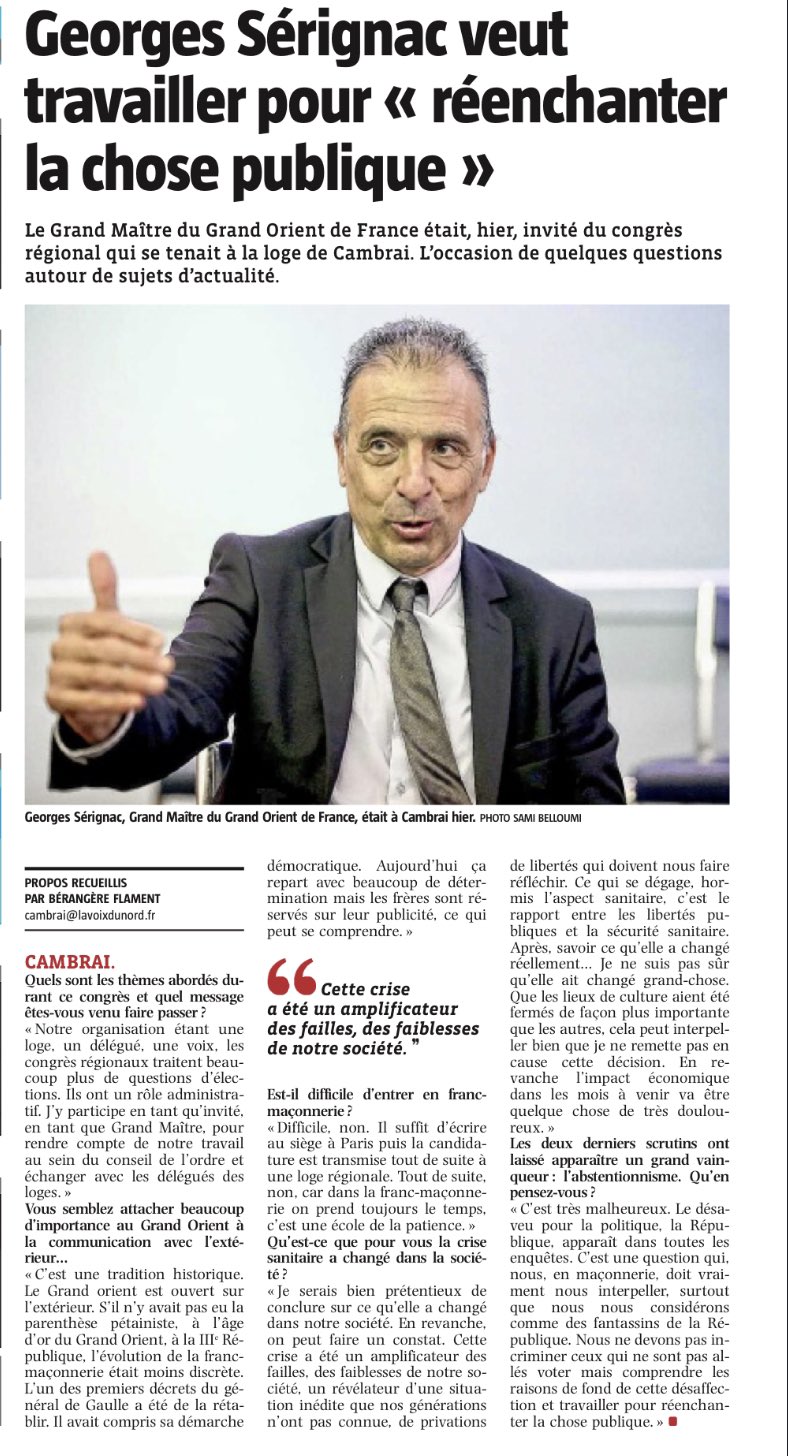 Georges SERIGNAC, Grand Maître du Grand Orient de France (GODF) était, samedi, invité du congrès régional de la région 10 qui se tenait à la loge de Cambrai.