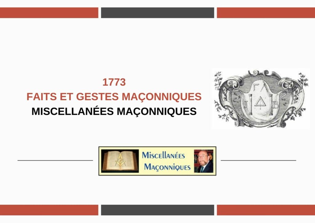 • Juin 1774. – Selon le tableau général du Grand Orient, il existe en France 104 loges régulières, constituées ou reconstituées par lui, dont 23 à Paris, 71 dans d’autres orients et 10 militaires. 45 loges sont en instance de reconnaissance.