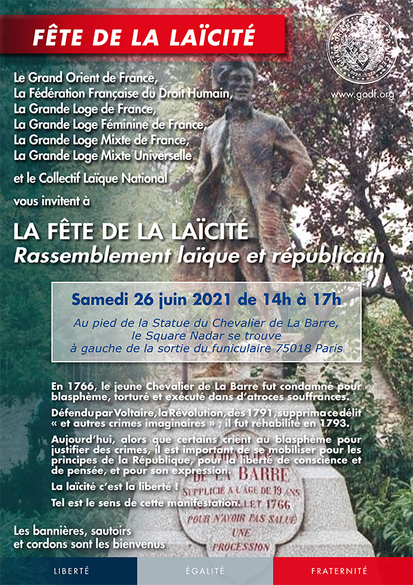 Rassemblement laïque et républicain organisé par des Obédiences maçonniques et le Collectif Laïque National au pied de la Statue du Chevalier de La Barre, au Square Nadar à PARIS.