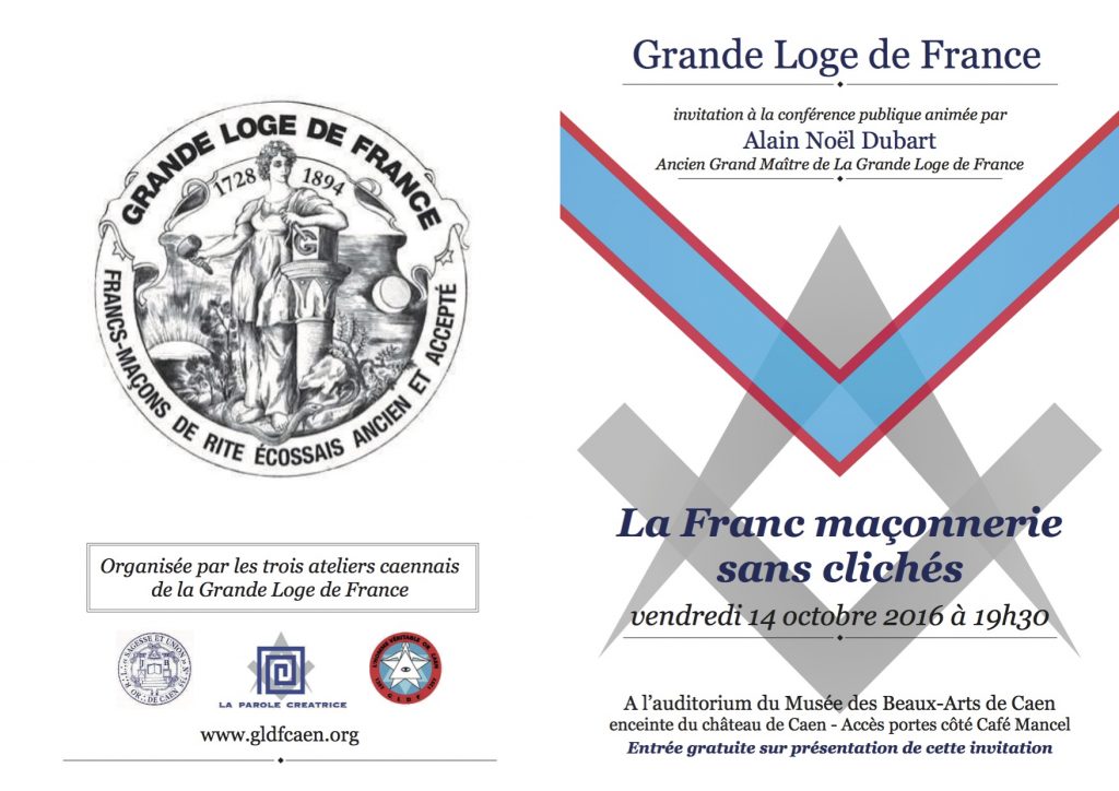 Caen – Vendredi 14 octobre 2016 à 19 heures 30, Conférence d’Alain Noël Dubart, ancien Grand Maître de la Grande Loge de France (GLDF) sur le thème « La Franc maçonnerie sans clichés »