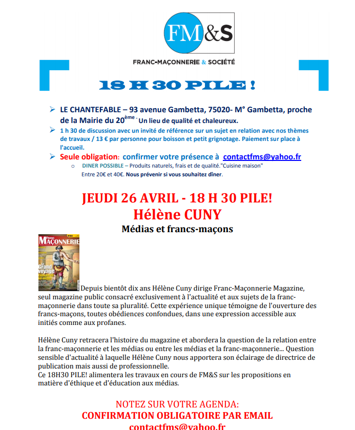 Hélène Cuny retracera l’histoire du magazine et abordera la question de la relation entre la franc-maçonnerie et les médias ou entre les médias et la franc-maçonnerie… Question sensible d’actualité à laquelle Hélène Cuny nous apportera son éclairage de directrice de publication mais aussi de professionnelle.