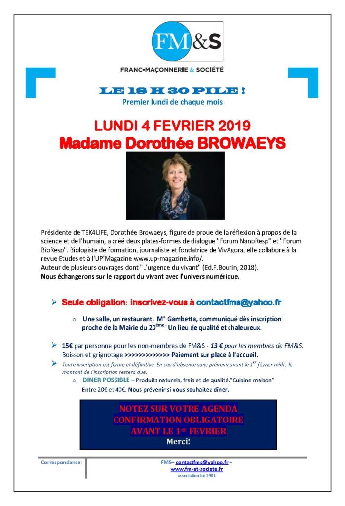FRANC-MAÇONNERIE ET SOCIÉTÉ – LE 18H30 PILE ! – L’UNIVERS NUMERIQUE ET LE VIVANT Evenements | 25 janvier 2019 | 0 | by A.S. Franc-maçonnerie & Société (FM&S), le think tank pour faire vivre la fraternité vous convie :