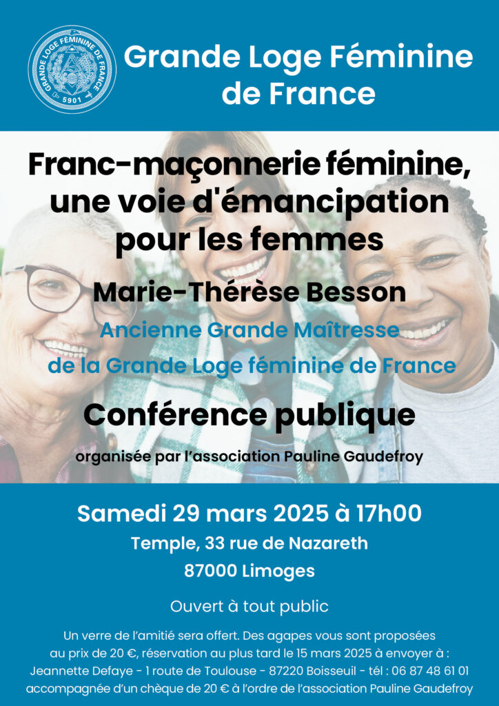 La Grande Loge Féminine de France (GLFF) vous invite à une conférence publique sur le thème « Franc-maçonnerie féminine, une voie d’émancipation pour les femmes » le samedi 29 mars 2025 à 17h.