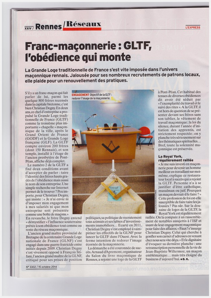 Franc-Maçonnerie : la GLTF une obédience qui monte selon l’Express Actualités | 16 octobre 2014 | 0 | by A.S. Un article intéressant dans l’édition Rennes de l’Express « Edition Rennes » du 15 au 21 octobre 2014 relatif à la Grande Loge Traditionnelle de France (GLTF) en Bretagne.
