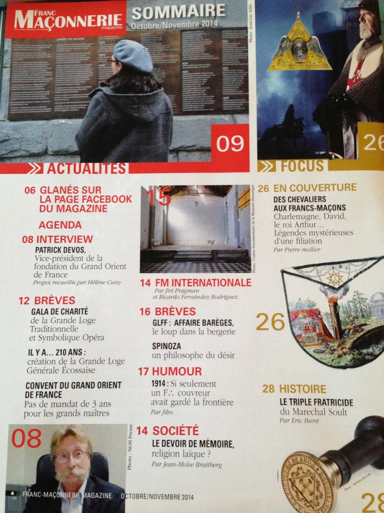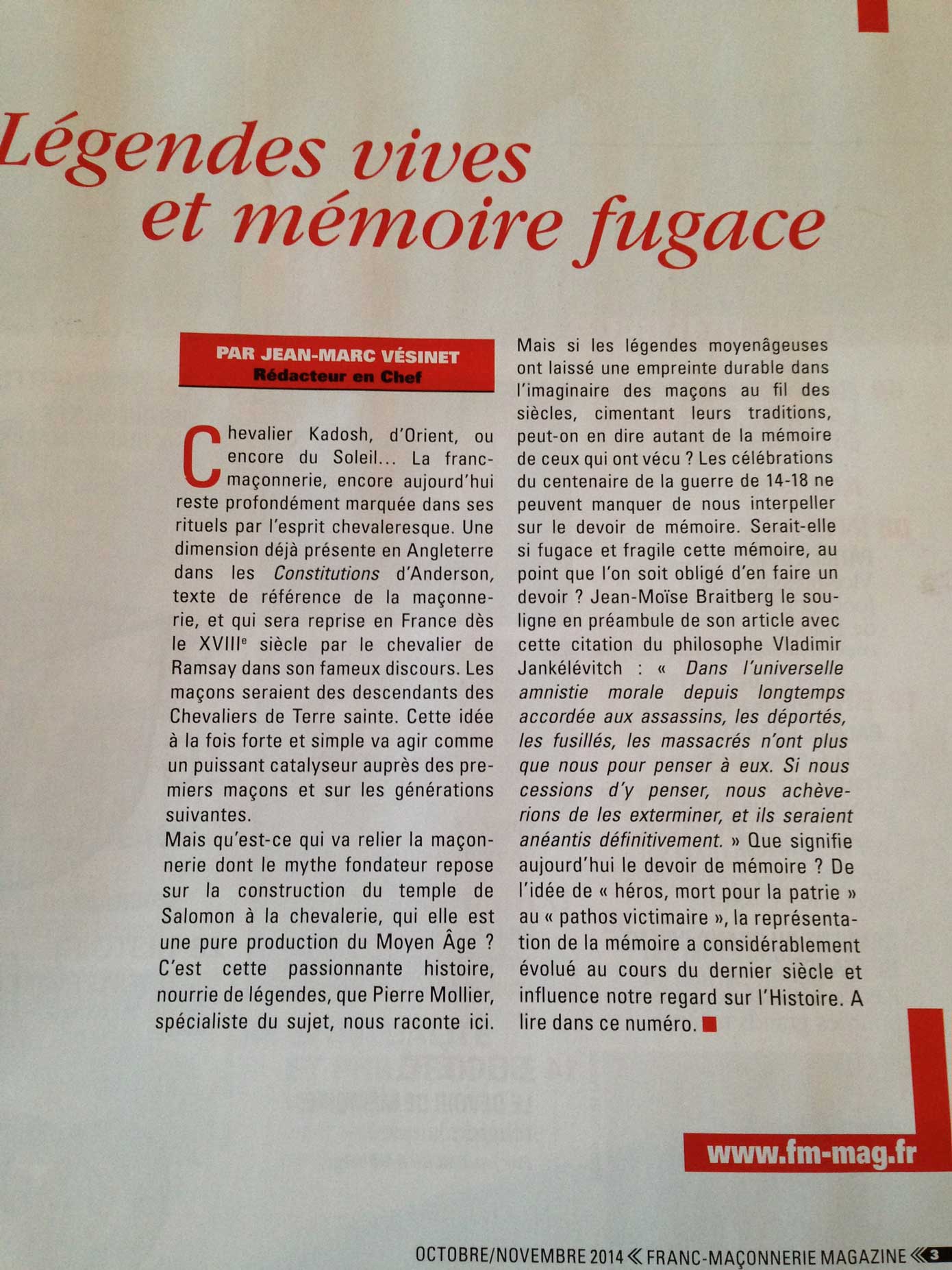 Franc-Maçonnerie Magazine N° 35 : Des chevaliers aux francs-maçons LIVRES / REVUES | 18 octobre 2014 | 0 | by A.S. Franc-Maçonnerie Magazine N° 35 ( 2014) est en kiosque avec un dossier « Des chevaliers aux francs-maçons, Charlemagne, David, le roi Arthur… Légendes mystérieuses d’une filiation » EDITO ET SOMMAIRE :