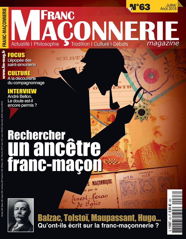 Franc-Maçonnerie Magazine N° 63 (Juillet/Août 2018) est sortie en kiosque et il consacre sa couverture à un dossier intitulé « Rechercher un ancêtre franc-maçon »