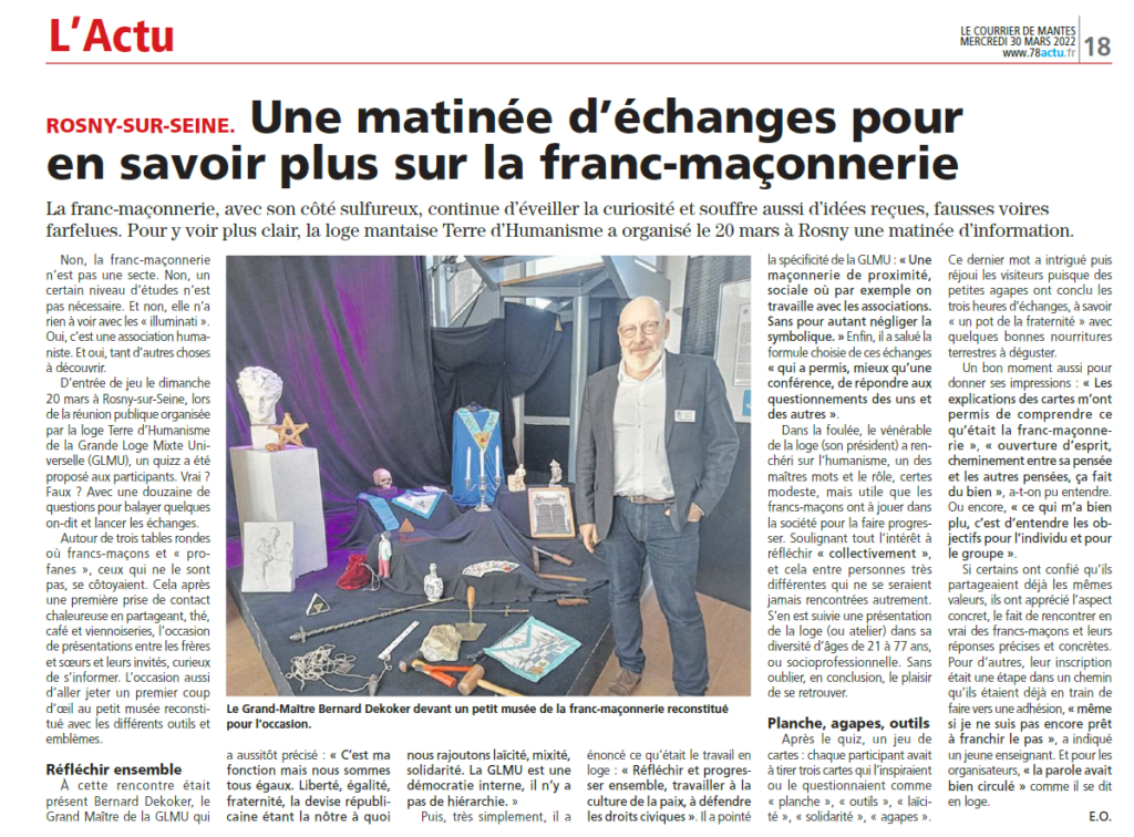 FRANC-MACONNERIE, PARLONS-EN A ROSNY SUR SEINE Actualités | 25 avril 2022 | 0 | by A.S. Une matinée d’échanges pour en savoir plus sur la franc-maçonnerie et la Grande Loge Mixte Universelle – Article dans le Courrier de Mantes le 30 mars 2022