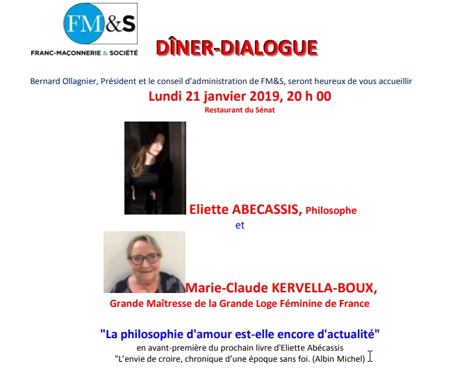 le 21 janvier à 20h au Restaurant du Sénat entreMarie-Claude KERVELLA-BOUX, Grande Maîtresse de la Grande Loge Féminine de France et Eliette ABECASSIS, philosophe, écrivain.