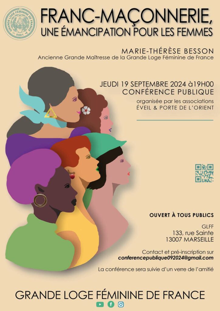 La Grande Loge Féminine de France et les associations Eveil et Porte de l’Orient vous invitent à une conférence publique sur le thème « Franc-maçonnerie, une émancipation pour les femmes » le jeudi 19 septembre 2024 à 19h00 à Marseille (13).