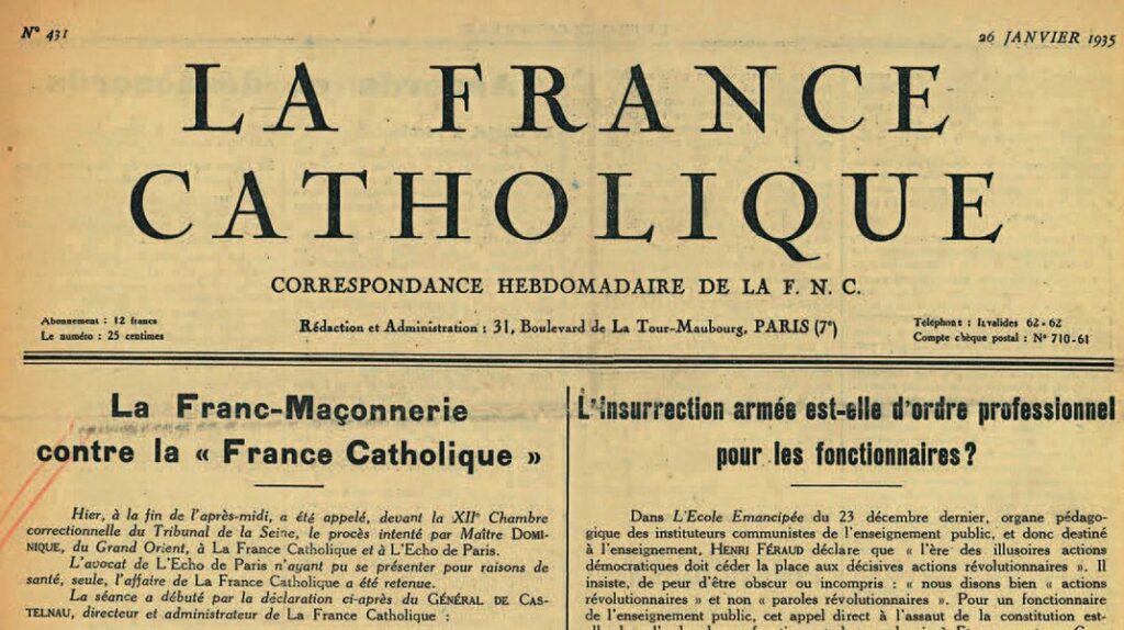 C’est dans ce contexte que La France Catholique publie en Une, dans le numéro 393 du 3 mars 1934, un article intitulé « La Vérité ». Commençant par « Français ! », le texte se termine par la consigne maçonnique : « On doit sentir la Maçonnerie partout. On ne doit la découvrir nulle part. » Sont nommées quinze personnes, dont Alfred Dominique, un avocat mêlé à l’affaire Stavisky, membre du Grand Orient.