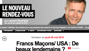 Sur France Inter, le jeudi 26 mai 2016, l’émission de Laurent Goumarre, le « Nouveau rendez-vous » était consacré au thème Francs Maçons/ USA : De beaux lendemains ?