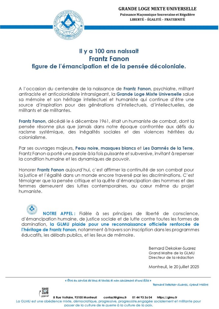 Communiqué de la Grande Loge Mixte Universelle (GLMU) : Il y a 100 ans naissait Frantz Fanon, figure de l’émancipation et de la pensée décoloniale.