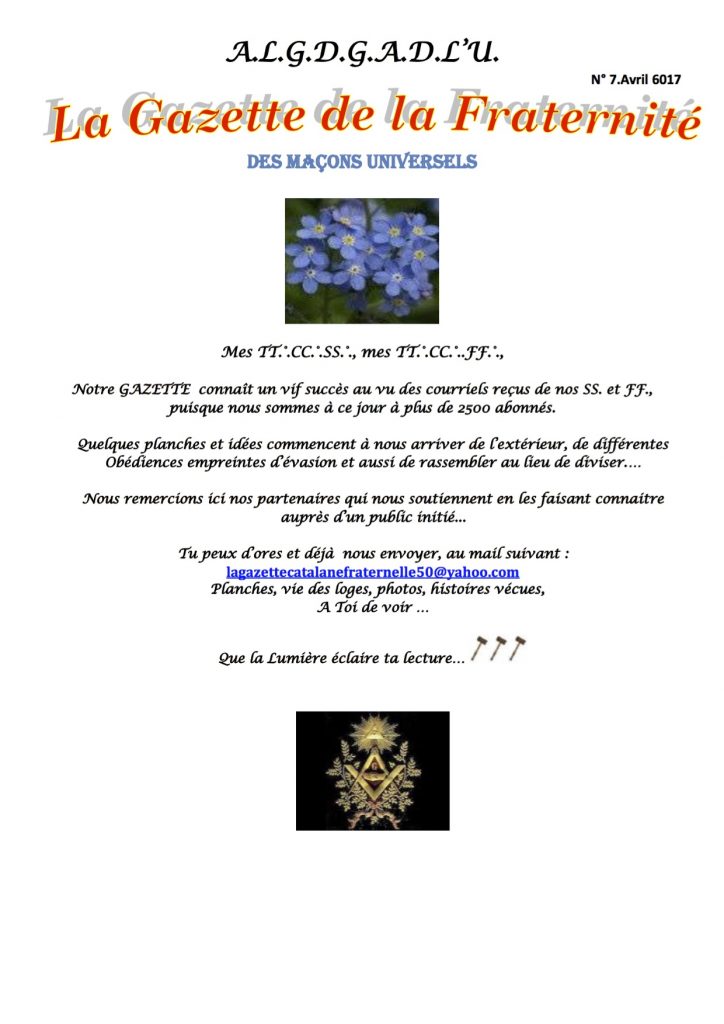 Voici le numéro 7 de Avril 2017 de Gazette Catalane de la Fraternité – Des Maçons Universels