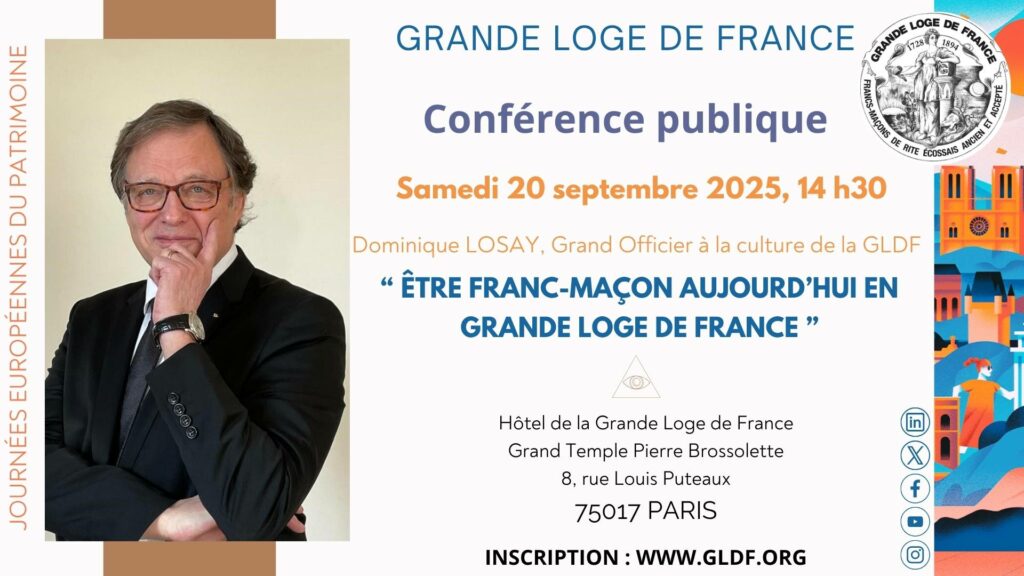 C’est le Très Respectable Frère Dominique Losay, Grand Officier à la Culture, qui lancera ce cycle avec une première manifestation sur le thème : « Être Franc-maçon aujourd’hui en Grande Loge de France », qui se déroulera le samedi 20 septembre 2025, à partir de 14 h 30, dans le Grand Temple Pierre Brossolette, à Paris.