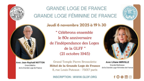 À l’occasion du 80ᵉ anniversaire de la Grande Loge Féminine de France (GLFF), une conférence publique exceptionnelle se tiendra le jeudi 6 novembre 2025, à l’Hôtel de la Grande Loge de France (GLDF), à Paris.
